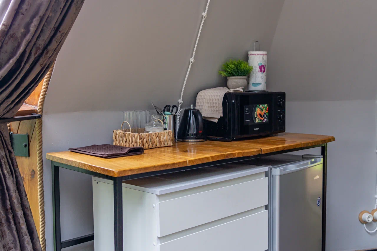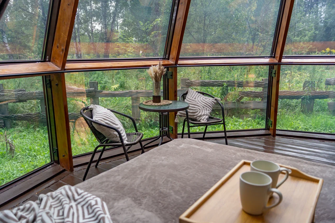 Идеально подойдет для спокойного и уютного отдыха молодой паре или семье с детьми. Дом рассчитан от 1 до 3 человек. Большое панорамное окно, комфортная двухспальная кровать, мини-кухня со всем необходимым, санузел и душ.
